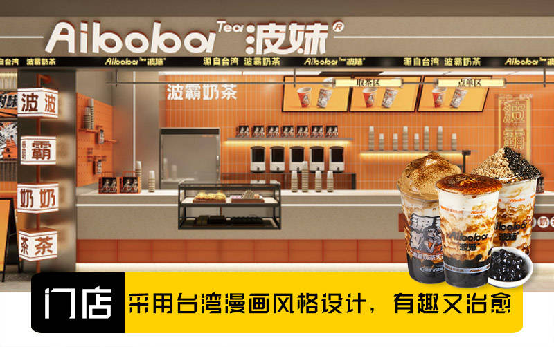 区别于潮流、网红、简约等目前市场上大部分茶饮的风格, 波妹®aiboba的门店以“波妹”人物的形象打造一个故事性的场景,提炼台湾漫画元素, 符合当下审美的同时,增加了品牌的地域性,也为消费群体创造了一个新的消费场景。