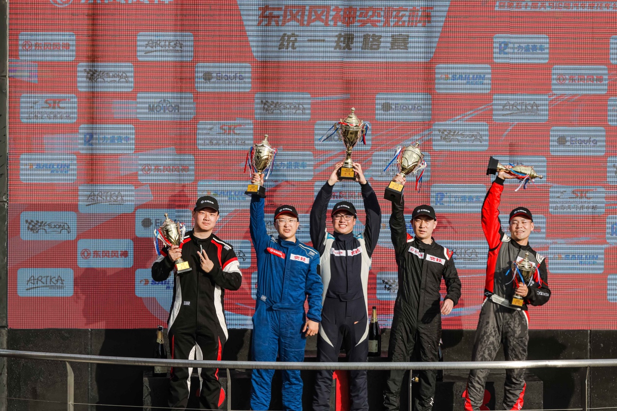 “奕炫杯”赛车手卢亦晟、于泽潭、李晗、刘祠、任富涛(从左至右)颁奖台领奖